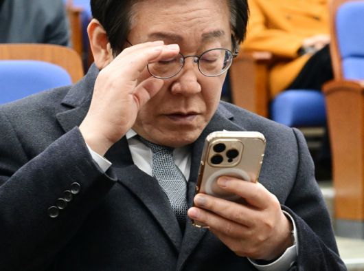 이재명 더불어민주당 대표가 19일 국회에서 열린 비상의원총회에서 휴대전화를 보고 있다. /이병화 기자 |