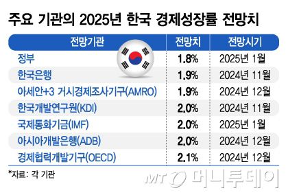 IMF뿐 아니다. 국내외 주요기관들은 최근 1~2달 사이 우리나라의 올해 성장률 전망치를 일제히 낮추고 있다. 비상계엄 사태로 촉발된 국내 정치 불안 상황을 반영해서다. 실제 △아세안+3 거시경제조사기구(2.1%→1.9%) △아시아개발은행(2.3%→2%) △경제협력개발기구(2.2%→2.1%) 등이 우리나라의 올해 성장률 전망치를 하향했다.