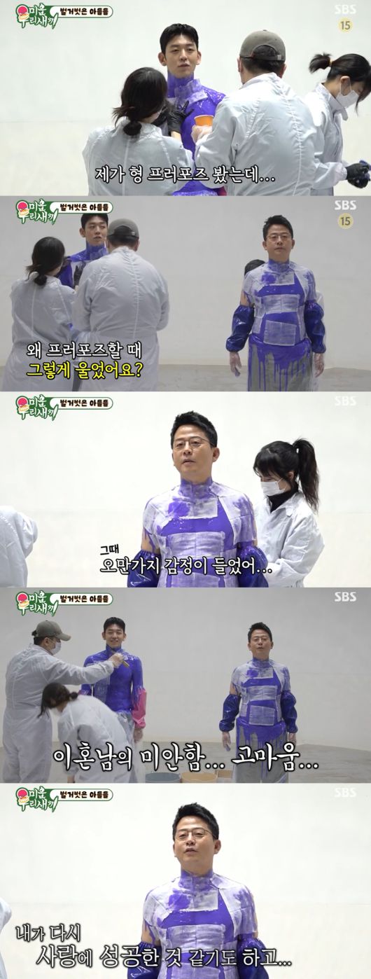 수중 바디 프로필 촬영을 마친 두 사람은 석고상 뜨기를 시작했다. 그 가운데 이용대는 "제가 형 프러포즈를 봤다. 왜 프러포즈할 때 그렇게 울었냐. 엉엉 울더라"고 물었고, 김준호는 "오만가지 감정이 있었다"고 답했다.
