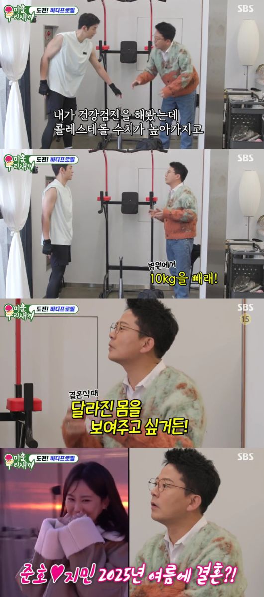 이용대는 바디프로필을 위해 두 달 동안 무려 7kg을 감량했다고. 김준호는 "내가 건강검진을 했는데 콜레스테롤 수치가 높아서 (병원에서) 10kg를 빼라고 한다"며 "나도 이제 결혼을 해야되니까 그 전에 달라진 몸을 결혼식장에서 보여주고 싶다"고 포부를 밝혔다.