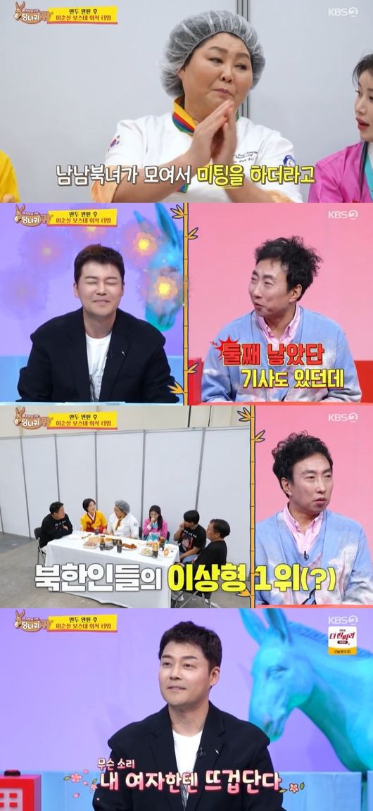 또 그는 "대한민국와서 어떤 일했냐면 남남북녀 모여서 미팅하더라. MC를 보면서 한 300명 모인다. 한번에 커플이 20, 30쌍 나온다"고 말했고, 김숙은 "남남북녀만 가능하면 현무 가능하네"라고 몰아갔다. 이에 전현무는 "이미 열애기사가 넘쳐서요. 거기까지 참여하면 북한여자까지 기사나면"이라고 말했고, 박명수는 "둘째낳았단 기사도 있더라"라고 가짜뉴스를 퍼트려 웃음을 자아냈다.