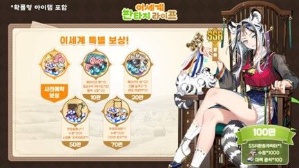 국내 출시를 앞두고 사전예약을 진행하는 ‘이세계 판타지 라이프’는 사전예약자 전원에게 풍성한 인게임 아이템을 제공하고, 사전예약자 수가 특정 수치를 달성할 때마다 더욱 푸짐한 혜택을 제공한다. 특히, 100만 사전예약자 수 돌파 시 이용자는 SSR 한국 한정 캐릭터 백호 ‘윤슬’과 함께 고급 아이템까지 받아볼 수 있다.