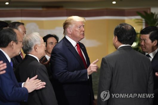 도널드 트럼프 미 대통령은 지난 2019년 서울 남산 하얏트 호텔에서 한국 기업인과 만났다. 트럼프 대통령은 ’한국 기업이 미국 투자를 확대하기에 적절한 기회“라며 투자를 독려했다. 당시 한성숙 네이버 대표, 권영수 LG 부회장, 이재용 삼성전자 부회장, 우기홍 대한항공 부사장, 류진 풍산 회장, 정용진 신세계 부회장, 김승연 한화 회장, 신동빈 롯데 회장, 허창수 GS 회장, 제임스 김 주한미국상공회의소 회장, 허영인 SPC 회장, 조현범 한국타이어 사장, 정의선 현대차그룹 수석부회장, 최태원 SK회장 등이 참석했다. |