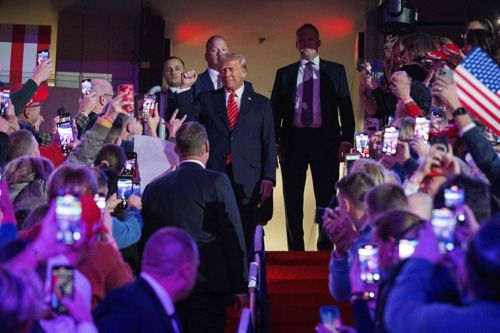 도널드 트럼프 미국 대통령 당선인이 19일(현지시간) 마가 승리 집회가 진행되는 워싱턴DC의 실내경기장 캐피털원아레나에 입장하고 있다. AFP연합뉴스 |