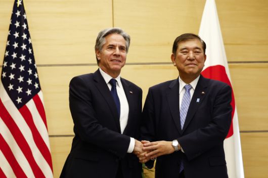 지난 7일 일본을 방문한 토니 블링컨 미국 국무부장관이 이시바 시게루 일본 총리와 악수를 나누고 있다. AP=연합뉴스 |
