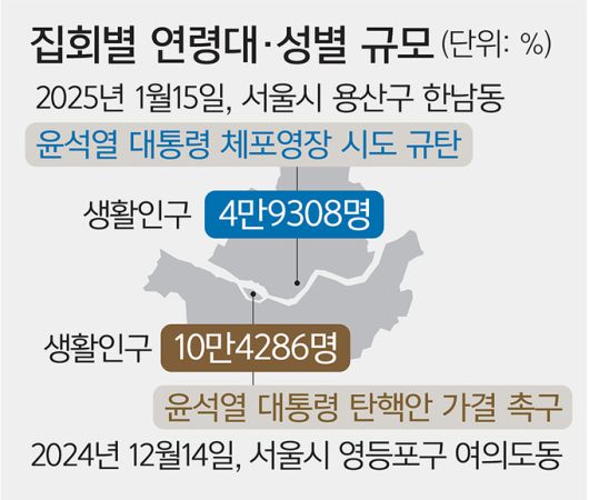 지난 15일 서울 용산구 한남동 대통령 관저 일대에 모인 4만9000여명을 연령대로 분석했더니 현장 참석자 4명 중 1명이 30∼40대 남성이었다. 지난달 14일 윤 대통령 탄핵을 촉구하는 서울 여의도 집회 참석자 4명 중 1명이 20∼30대 여성이었던 것과 대조적이다. 윤 대통령 탄핵 집회는 젊은 여성이, 체포 저지 집회는 젊은 남성이 주도했다는 평가가 나온다.