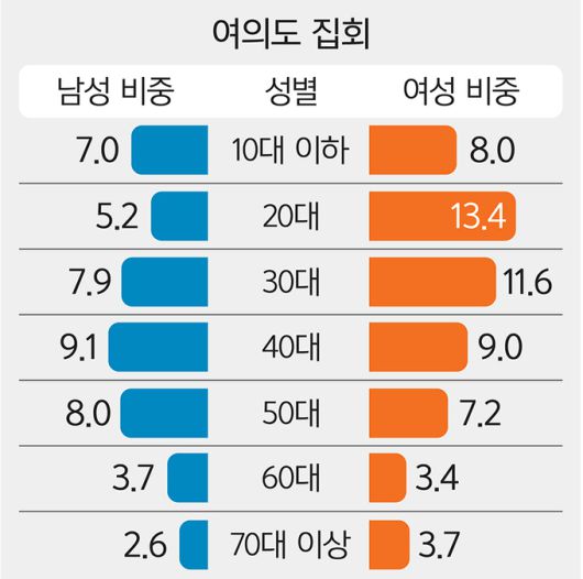 여의도동에 결집한 인구는 오후 8시 기준 10만4286명이었는데, 이 중 20대 여성이 13.4%, 30대 여성이 11.6%를 차지했다. 이어 40대 남성(9.1%), 40대 여성(9.0%) 순이었다.