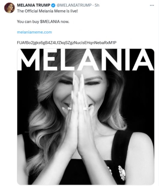 도널드 트럼프 미국 대통령 부인인 멜라니아 트럼프 여사가 19일(현지시간) 자신의 이름을 건 가상화폐 ‘$멜라니아’를 발행한 사실을 홍보하는 소셜미디어(SNS) 엑스(X·옛 트위터) 게시물. X 캡처 |