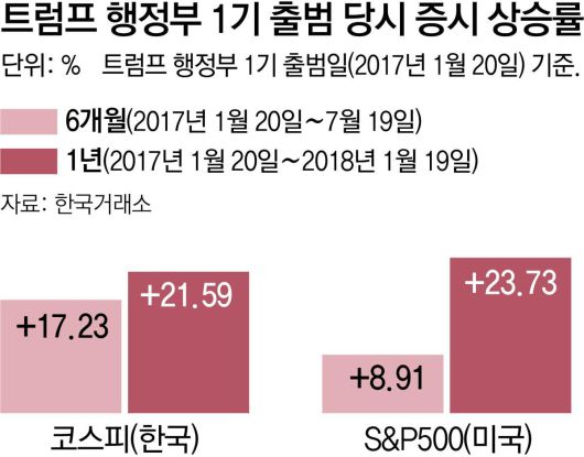 트럼프의 대표적인 경제 정책은 기업 감세다. 이에 기업 실적은 높아지고, 주가는 상승할 수 있다는 기대 섞인 분석이 제기된다. 실제 트럼프 행정부 1기 출범 이후 6개월 만에 미국 스탠더드앤드푸어스(S&P)지수가 1년 만에 23.73% 상승하는 등 ‘트럼프 랠리’가 이어졌다. 코스피 역시 같은 기간 21.59% 상승하면서 트럼프 효과를 톡톡히 봤다.