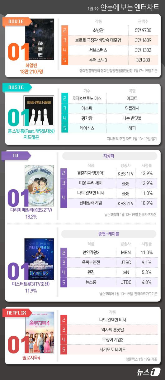 1월 셋째 주 음원차트는 직전 주와 동일했다. 지드래곤의 '홈 스위트 홈'(HOME SWEET HOME)은 1월 3주 차 지니 주간차트에서 1위를 차지하며 8주 연속 정상의 자리를 지켰다. 빅뱅 특유의 음악적인 색채를 담은 '홈 스위트 홈'은 빅뱅 멤버 대성과 태양이 피처링에 참여해 그 의미를 더한다. 덕분에 발매 후 팬들은 물론 K팝 리스너들에게도 사랑을 받고 있다. 2위는 블랙핑크 로제와 브루노 마스의 '아파트.'(APT.)가 차지했다. 지난해 10월 발매된 곡은 대중에게 꾸준히 사랑받으며 차트를 장기집권하고 있다. 3위는 에스파 '위플래시'(Whiplash), 4위는 황가람의 '나는 반딧불', 5위는 데이식스의 '해피'(Happy)가 각각 이름을 올렸다.