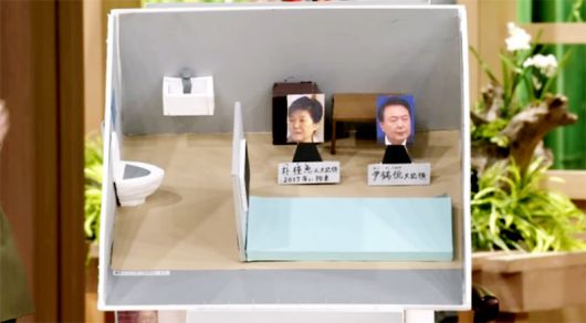 19일 TBS는 “비슷한 독방에 8년 전 박근혜 전 대통령도 수용된 것으로 보인다”고 보도했다. 이어 윤 대통령 얼굴 사진 모형 옆으로 박 전 대통령의 얼굴 사진을 추가했다. 서울 구치소 독방은 약 3평 크기로 접이식 매트리스, TV, 1인용 책상 겸 밥상 등 기본 수용 물품이 갖춰져 있다. |