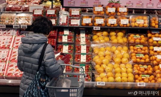 겨울철 대표 과일인 감귤과 딸기 가격이 강세를 보이고 있는 가운데 27일 서울의 한 대형마트에서 장을 보러온 시민들이 과일을 고르고 있다. /사진=뉴스1 |