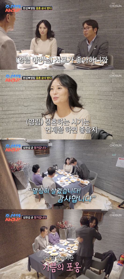 심현섭은 “그래서 식사 자리에서 이 말 드리는 게 맞는 건지 싶다”며 심현섭은 “미래에 평생 짝이 되어 가장으로 남편으로 행복하게 재밌게 잘 살수 있도록 결혼을 승낙해주시면 감사하겠다”며 진심을 담아 이야기를 꺼냈다. 이에 여자친구 부친은 “딸이 워낙 좋아하니까, 승낙하는 것과 진배 없다”며 승낙했다. 그러면서 “특별히 반대할 이유가 없다 둘다 좋아하기 때문”이라 했다. 모친도 “앞으로 예쁘게 잘 살았으면 좋겠다”고 했다.
