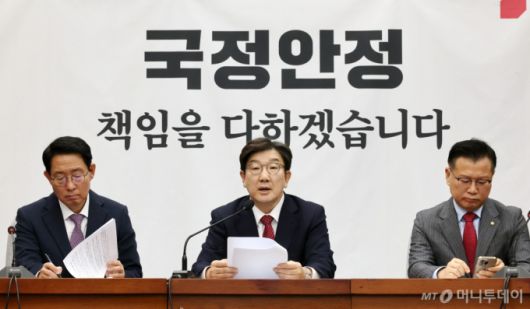 권 원내대표는 '조기대선을 생각해 당 지도부가 극우진영과 선을 그어야 한다는 의견이 나온다'는 물음엔 "극우진영이란 게 어떤 의미로 말씀하는 건지 잘 모르지만 우리 당은 우리 당을 지지하는 모든 국민들을 포용하는 정당"이라며 "당은 당 나름대로 중심을 잡고 균형잡힌 시각으로 행보하고 있다"고 했다.