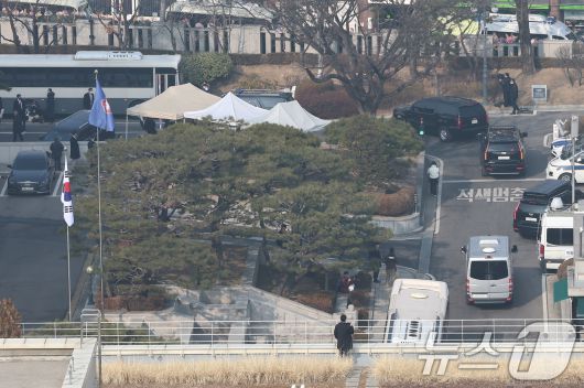(서울=뉴스1) 김도우 기자 = 윤석열 대통령이 탑승한 법무부 호송차량이 21일 윤 대통령 탄핵 심판 3차변론기일이 열리는 서울 종로구 헌법재판소로 향하고 있다. 2025.1.21/뉴스1