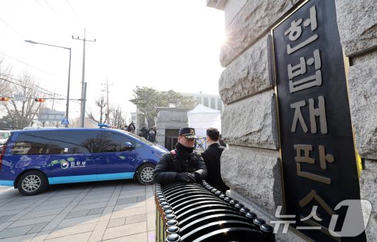 (서울=뉴스1) 박지혜 기자 = 윤석열 대통령이 탑승한 법무부 호송차량이 21일 서울 종로구 헌법재판소로 들어서고 있다. 윤 대통령은 이날 오후 2시에 열리는 탄핵 심판 변론에 직접 출석한다. 2025.1.21/뉴스1pjh2580@news1.krCopyright ⓒ 뉴스1. All rights reserved. 무단 전재 및 재배포, AI학습 이용 금지.