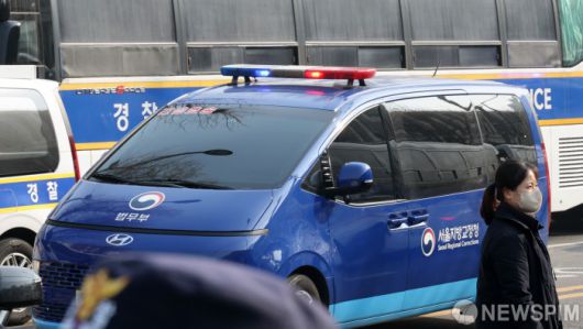 [서울=뉴스핌] 최지환 기자 = 윤석열 대통령이 탑승한 차량이 21일 오후 서울 종로구 헌법재판소에 도착하고 있다. 윤 대통령은 오늘 오후 2시부터 시작하는 대통령 탄핵 심판 3차 변론기일에 참석한다. 2025.01.21 choipix16@newspim.com