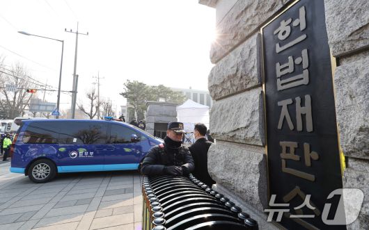 (서울=뉴스1) 박지혜 기자 = 윤석열 대통령이 탑승한 법무부 호송차량이 21일 서울 종로구 헌법재판소로 들어서고 있다. 윤 대통령은 이날 오후 2시에 열리는 탄핵 심판 변론에 직접 출석한다. 2025.1.21/뉴스1pjh2580@news1.krCopyright ⓒ 뉴스1. All rights reserved. 무단 전재 및 재배포, AI학습 이용 금지.
