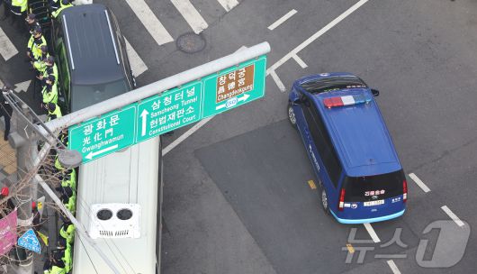 (서울=뉴스1) 김도우 기자 = 윤석열 대통령이 탑승한 법무부 호송차량이 21일 윤 대통령 탄핵 심판 3차변론기일이 열리는 서울 종로구 헌법재판소로 향하고 있다. 2025.1.21/뉴스1pizza@news1.krCopyright ⓒ 뉴스1. All rights reserved. 무단 전재 및 재배포, AI학습 이용 금지.