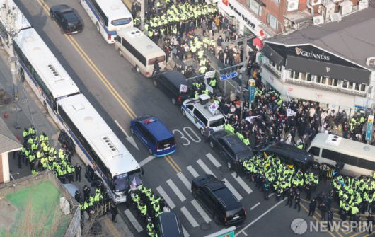 [서울=뉴스핌] 김학선 기자 = 헌재 탄핵심판 3차 변론기일에 출석하는 윤석열 대통령을 태운 차량과 경호차량이 21일 서울 종로구 헌법재판소에 도착하고 있다. 2025.01.21 yooksa@newspim.com