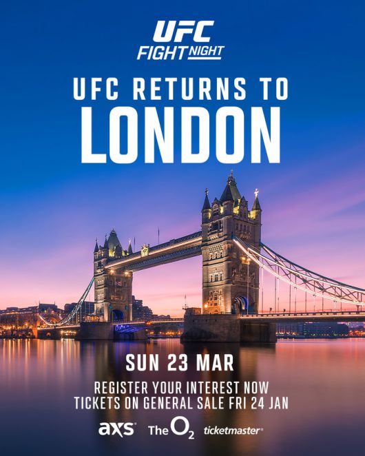 이번 UFC 런던 대회는 오는 24일 오후 7시부터 AXS와 티켓마스터를 통해 일반 티켓 판매가 시작된다. UFC 파이트클럽 회원은 오는 22일부터 UFC 런던 대회 페이지(ufc.com/London)에서 관심 등록을 하면 23일 오후 7시부터 우선적으로 예매할 수 있다.