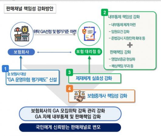 올 하반기부터 보험대리점(GA)에 대해 유지율, 불완전판매비율, 수수료정책 등을 1~5등급으로 나눠 종합 평가하고 등급이 낮은 GA에 판매를 위탁한 보험사는 추가 자본을 쌓아야 한다. 소속 설계사 500명 이상의 GA는 최소 2명 이상의 준법지원 인력을 확보해야 하며 GA의 소비자 배상책임을 높이기 위해 영업보증금은 최고 5억원으로 상향된다.