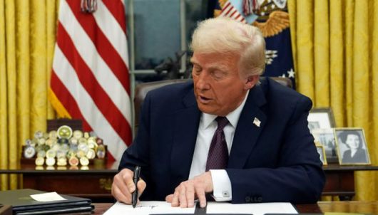 도널드 트럼프 미국 대통령이 취임 첫날인 20일(현지시간) 백악관 집무실에서 행정명령에 서명하고 있다. 사진=AP/뉴시스 |