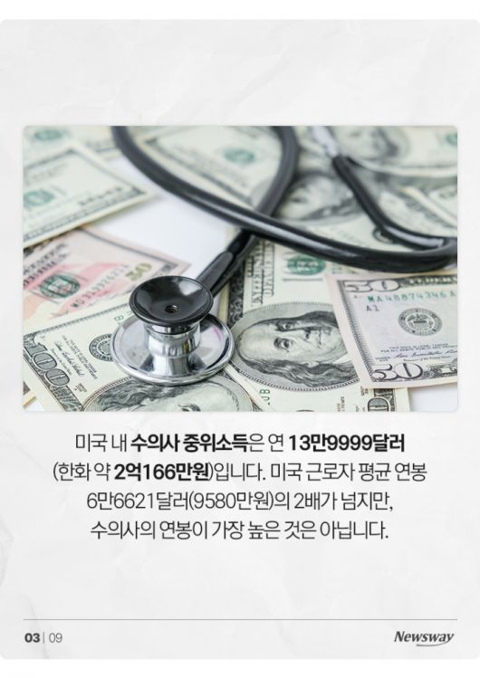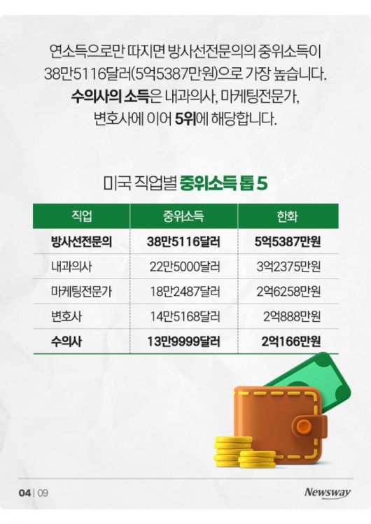 연소득으로만 따지면 방사선전문의의 중위소득이 38만5116달러(5억5387만원)으로 가장 높습니다. 수의사의 소득은 내과의사, 마케팅전문가, 변호사에 이어 5위에 해당합니다.