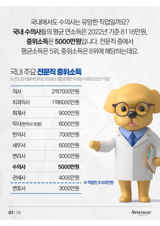 국내에서도 수의사는 유망한 직업일까요? 국내 수의사들의 평균 연소득은 2022년 기준 8116만원, 중위소득은 5000만원입니다. 전문직 중에서 평균소득은 5위, 중위소득은 8위에 해당하는데요.