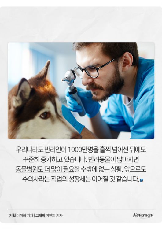 우리나라도 반려인이 1000만명을 훌쩍 넘어선 뒤에도 꾸준히 증가하고 있습니다. 반려동물이 많아지면 동물병원도 더 많이 필요할 수밖에 없는 상황. 앞으로도 수의사라는 직업의 성장세는 이어질 것 같습니다.