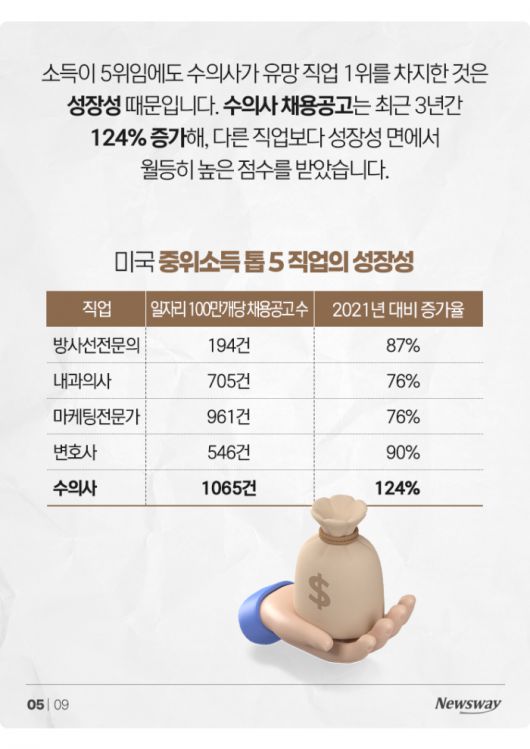 소득이 5위임에도 수의사가 유망 직업 1위를 차지한 것은 성장성 때문입니다. 수의사 채용공고는 최근 3년간 124% 증가해, 다른 직업보다 성장성 면에서 월등히 높은 점수를 받았습니다.