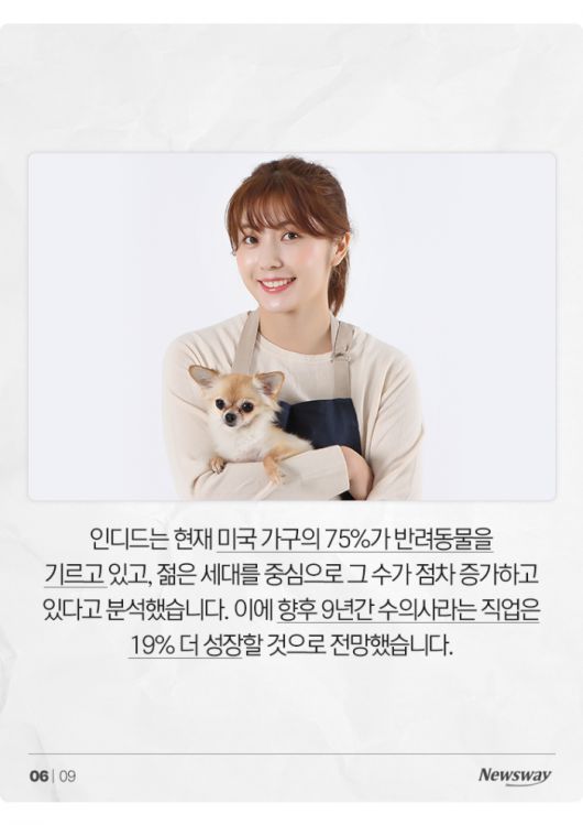 인디드는 현재 미국 가구의 75%가 반려동물을 기르고 있고, 젊은 세대를 중심으로 그 수가 점차 증가하고 있다고 분석했습니다. 이에 향후 9년간 수의사라는 직업은 19% 더 성장할 것으로 전망했습니다.