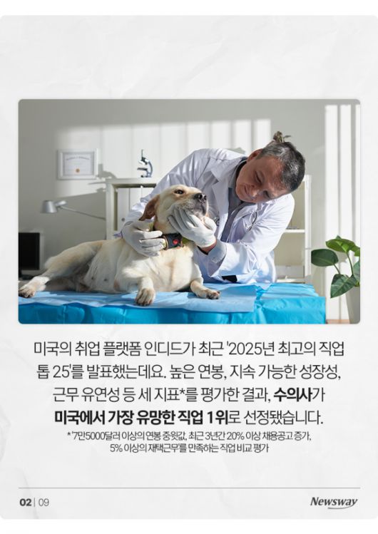 미국의 취업 플랫폼 인디드가 최근 '2025년 최고의 직업 톱 25'를 발표했는데요. 높은 연봉, 지속 가능한 성장성, 근무 유연성 등 세 지표를 평가한 결과, 수의사가 미국에서 가장 유망한 직업 1위로 선정됐습니다.