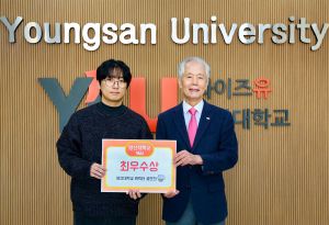 (왼쪽부터 : 최우수상을 수상한 만화애니메이션학과 박규현(왼쪽) 학생, 부구욱 총장)/제공=와이즈유 |