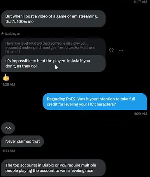 그러면서도 POE2 캐릭터를 글로벌 랭킹에 오를 정도로 육성한 것을 커뮤니티에 인정 받고 자랑할 의도는 없었다고 못박았다. 또한, 대리 의혹을 비판 중인 POE2 커뮤니티에 사과할 의사는 전혀 없다고 말했다.