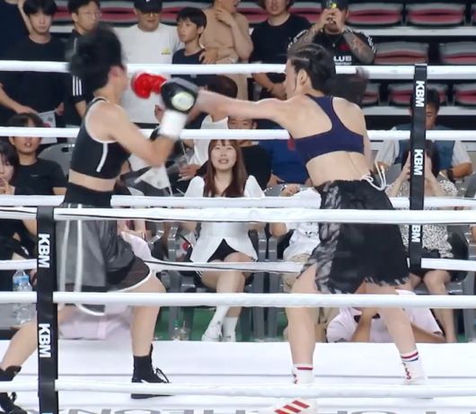 서려경(사진 오른쪽)이 상대 선수의 얼굴에 강력한 펀치를 적중 시키고 있다. 사진은 지난해 8월 열린 경기. 한국복싱커미션(KBM) 유튜브 영상 캡처