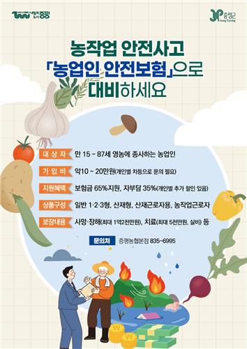 가입 대상은 증평군에 주소를 둔 15세∼87세 농업인이다.보험 상품은 일반형과 산재형으로 농업인은 원하는 보장 내역을 선택해 가입할 수 있다.