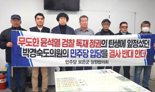 (보은=연합뉴스) 박병기 기자 = 더불어민주당 충북 보은지역 당원들은 22일 "최근 국민의힘에서 민주당으로 당적을 바꾼 박경숙 충북도의원의 입당을 받아들일 수 없다"며 차기 군수 출마를 염두에 둔 입당설에 대한 해명을 촉구했다.