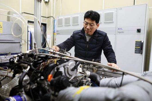 박철웅 한국기계연구원 친환경모빌리티연구실 책임연구원이 암모니아 엔진을 살펴보고 있다. |