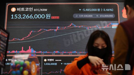 [서울=뉴시스] 추상철 기자 = 20일 오전 서울 서초구 빗썸라운지 전광판에 비트코인 시세가 나타나고 있다. 비트코인은 트럼프 대통령 취임식을 앞둔 지난 19일 밤 1억5999만원까지 오르며 원화 신고가를 경신한 후 20일 현재 하락세를 보이고 있다. 2025.01.20. scchoo@newsis.com |