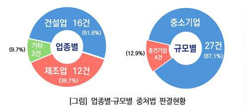 규모별로 중소기업이 27건으로 87.1%를 차지했고 중견기업에서 4건(12.9%)이 나왔다. 현재까지 대기업 사례에 대한 판결은 없다.