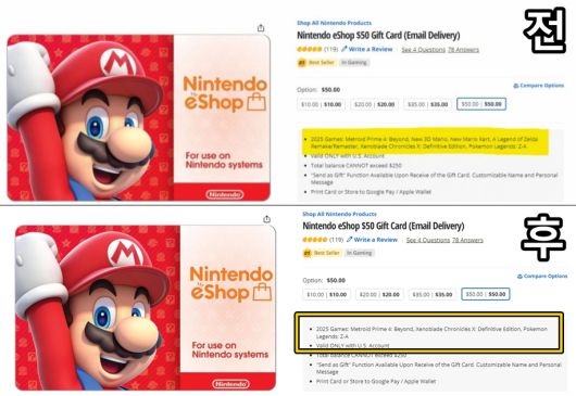 기프트 카드의 제품 설명에 따르면 2025년에는 '메트로이드 프라임4: 비욘드', '포켓몬 레전즈 Z-A'. '제노 블레이드 크로니클스 X'와 같이 일전에 공개된 타이틀을 포함해 3D 마리오, 마리오 카트, 젤다의 전설 리메이크 등 미공개 신작이 명시됐다.