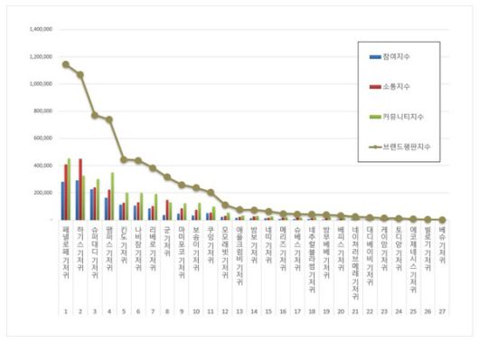 브랜드에 대한 평판은 브랜드에 대한 소비자들의 활동 빅데이터를 참여가치, 소통가치, 소셜가치, 시장가치, 재무가치로 나누게 된다. 기저귀 브랜드 브랜드평판지수는 참여지수, 소통지수, 커뮤니티지수로 분석했다.