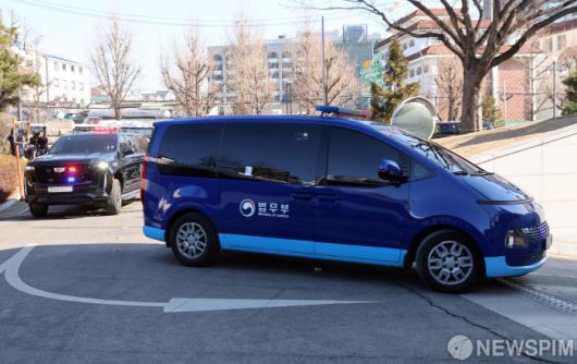 [서울=뉴스핌] 사진공동취재단 = 23일 서울 종로구 헌법재판소에서 열린 윤석열 대통령 탄핵심판 4차 변론기일에서 윤석열 대통령이 탄 차량이 헌재 안으로 들어서고 있다. 2025.01.23 photo@newspim.com