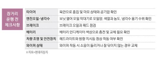 설 명절을 맞아 고향집을 방문하거나 여행을 떠나기 위해 장거리 운전을 해야 하는 경우가 많다. 막히는 도로 한복판에서 차량이 고장 나 낭패를 보지 않으려면 사전점검이 필요하다. 장거리 운행 전 꼭 점검해야 할 사항들을 체크해보자.