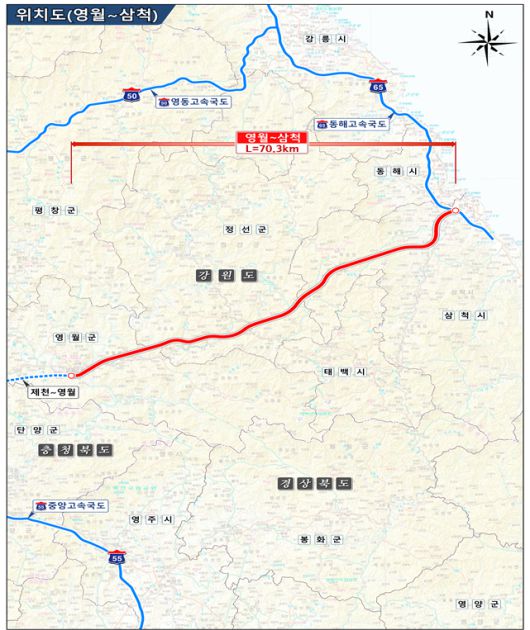 영월~삼척 고속도로 건설사업은 강원특별자치도 남부 지역의 접근성을 대폭 개선하기 위해 영월군에서 삼척시를 연결하는 고속도로로, 총 70.3km의 왕복 4차로를 신설하는 사업이다. 강원도 영월군 영월읍부터 삼척시 등봉동까지 70.3㎞로 총사업비 5조6167억원 규모다.