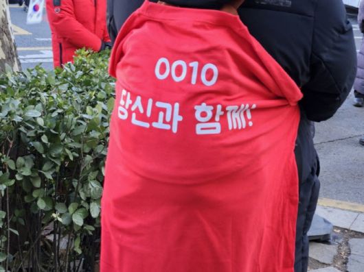 [이데일리 박지혜 기자] 윤석열 대통령 탄핵 반대 집회에 ‘0010’ 티셔츠가 등장했다.