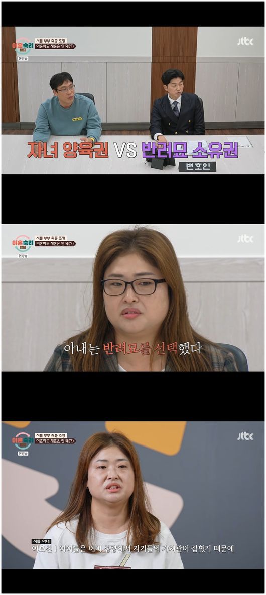 양육권에 대해서 아내 이효선은 깔끔하게 물러났다. 일단 성인이 되기 직전인 아이들이기에 전문가들은 한 발 물러나는 모습을 보였다. 단 반려묘에 대한 애정은 남달랐다. 염정식은 “고양이는 아내의 성씨를 따랐다. 저도 고양이를 데리고 오고 싶지만”라며 아내에게 양보하는 모습을 보였다. 이효선은 “고양이 엄마는 저다”라며 나섰다.