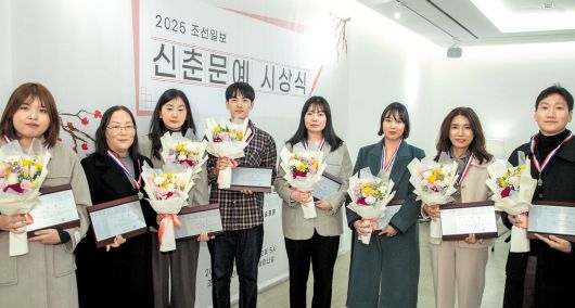 23일 오후 서울 세종대롤 조선일보사에서 '2025 조선일보 신춘문예 시상식'이 열렸다. 당선자 8명과 심사위원들. /장련성 기자 |