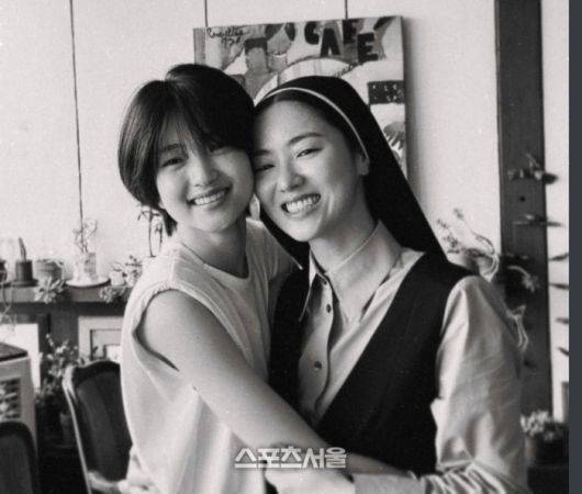 사진 속 수녀복 차림의 전여빈은 현장을 방문한 김태를 꼭 끌어안고 다정하게 포즈를 취하고 있다.